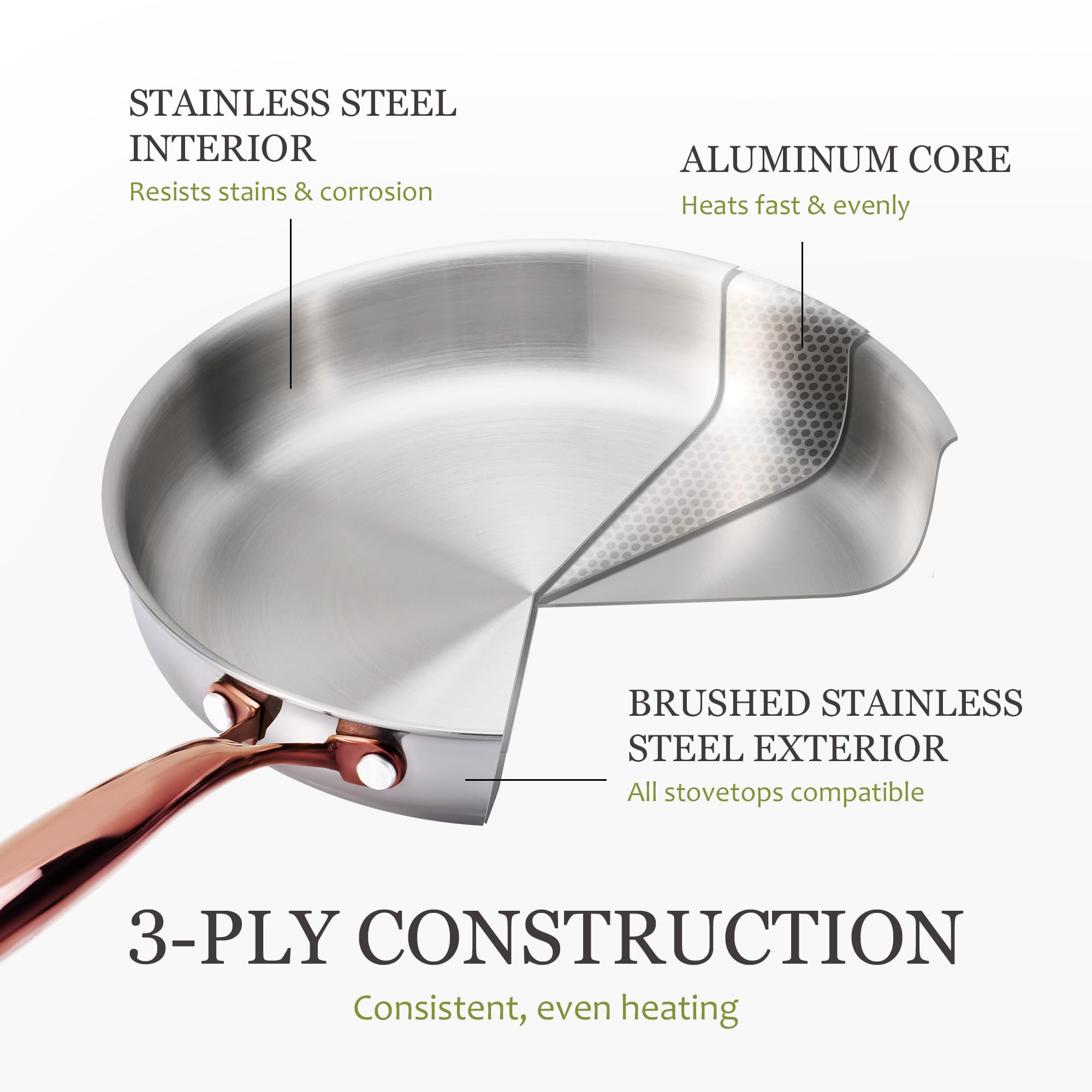 - Fast & Even Heating â 3-PLY fully bonded from base to rim for consistent performance and durability; the stainless surface sears beautifully and is ideal for deg-lazing to make pan sauces.