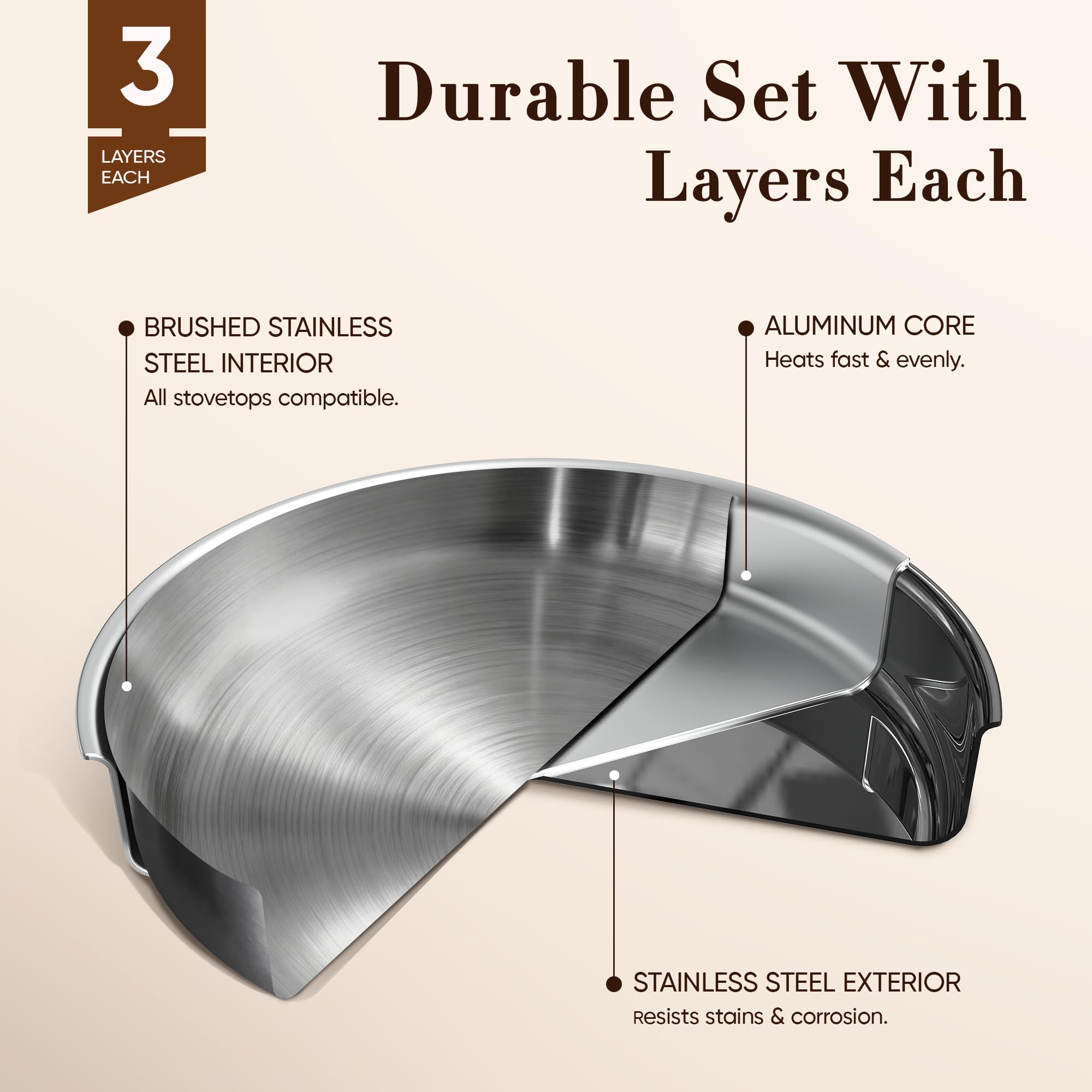 - 3-PLY FULL CLAD, FAST & EVEN HEAT — Tri-ply stainless construction heats quickly and spreads heat evenly up the sides for steady cooking and better control.