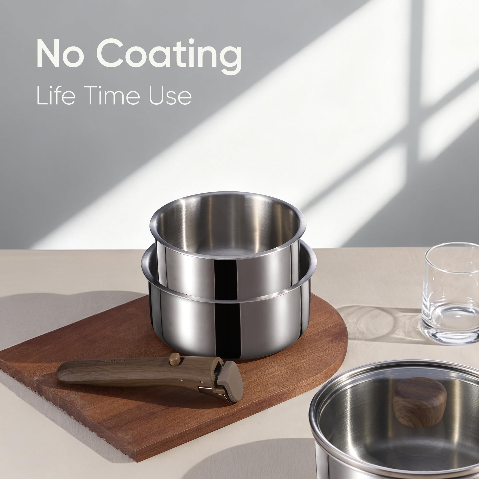 CAROTE Tri-Ply Stainless Steel Sauce Pan with Detachable Handle,1.5QT Sauce Pan & 3QT Saucepan with Lid, 5PCS Non-Toxic Induction Kitchen Stainless Steel Pot,Removable Handle,Oven Safe,Woodgrain
